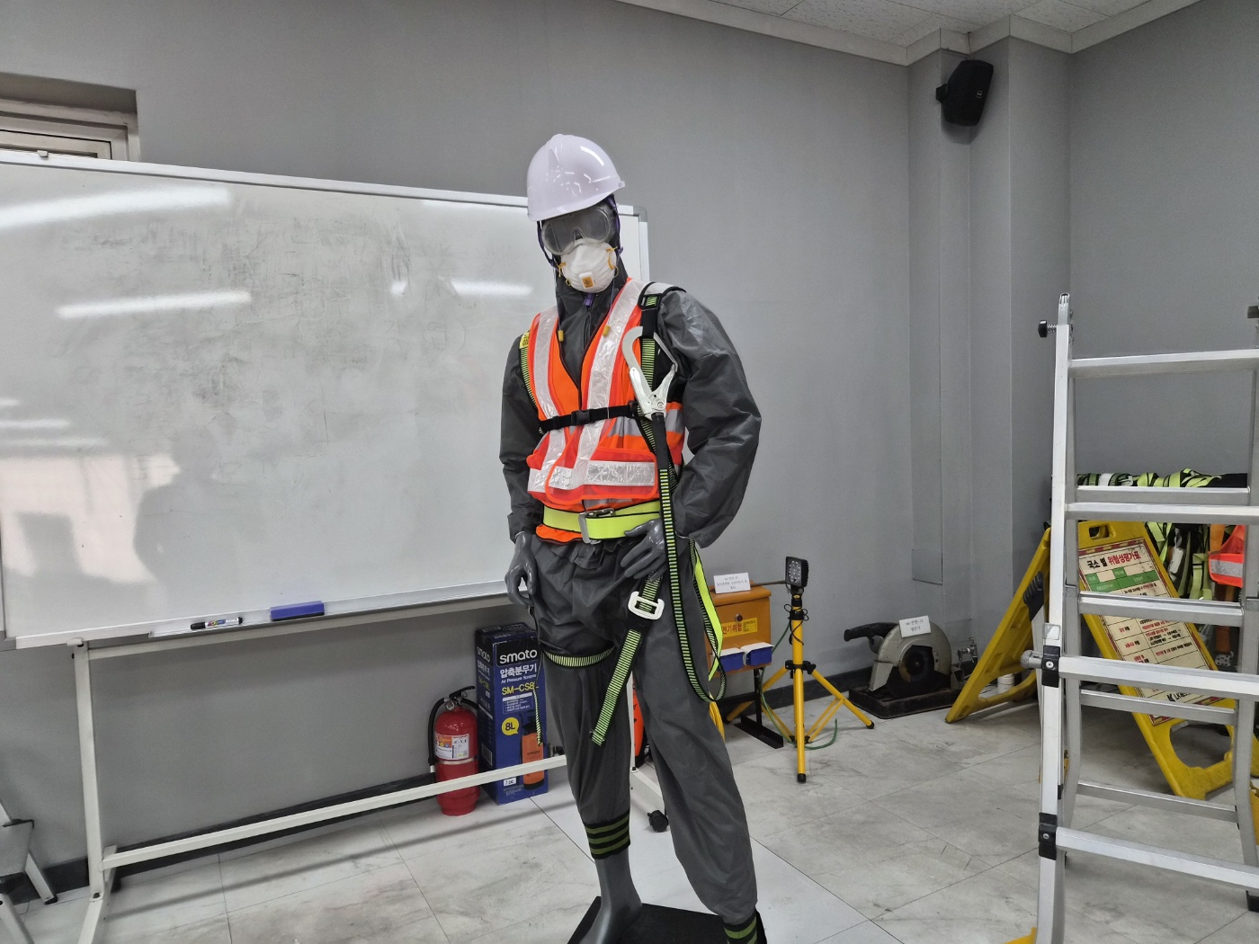 모든 교육은 보호장비 착용 실습으로 시작합니다. 안전모, 안전화, 안전대, 장갑, 보호안경 등 필수 장비를 직접 착용하며 “턱끈을 느슨하게 매면 어떤 사고로 이어질 수 있는가”를 실제 영상과 함께 학습합니다. 교육생들은 착용 전후 차이를 비교하며, 단순한 장비 하나가 ‘생명줄’이 될 수 있음을 실감하게 됩니다.